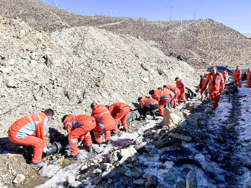 在海拔近5000米的抢修一线,工作人员按照分工,进行照明、零配件整理和传递、沟渠作业、更换管道等工作。在一次次开关水闸冲掉管道冰碴的过程中,冰冷刺骨的水早已将大家的衣物打湿,但是工作人员依然争分夺秒抢修,配合紧密无间。大家的裤脚鞋子上都沾满了泥泞,脸上更是冻得通红,但想到前方的员工回到宿舍后能吃上热饭菜,洗上热水澡,每个人都洋溢着开心的笑容。