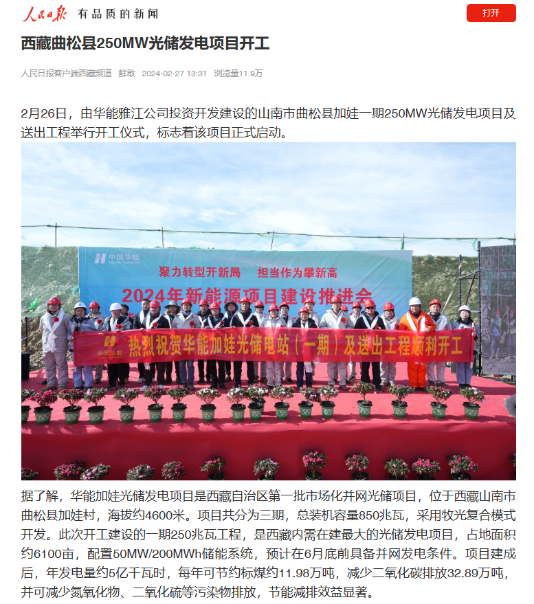 2月26日,由水电十局承建的华能加娃光储电站一期250兆瓦光储发电项目及送出工程举行开工仪式获《人民日报》关注。