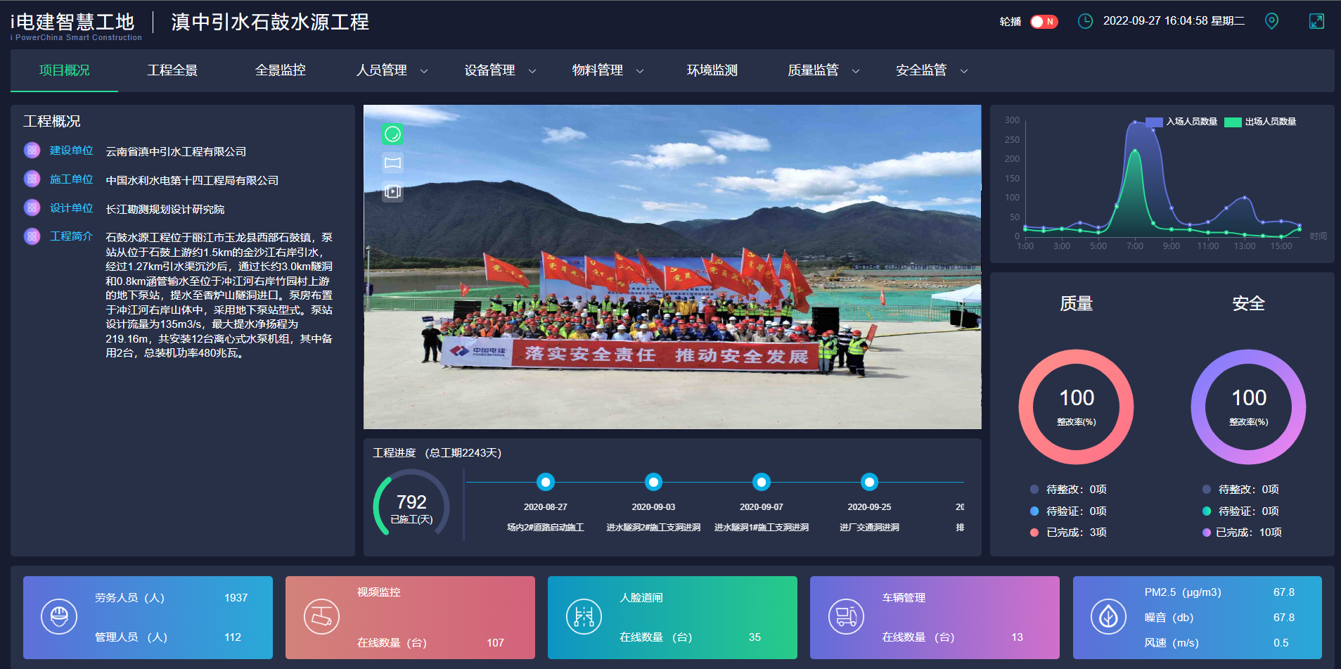滇中引水石鼓水源工程智慧工地是把传统项目管理结合互联网的一种新的管理系统,应用最新的大数据、云计算和物联网的技术,对施工现场的人、机、料、法、环等多方面资源进行集中管理,以可控化、数据化以及可视化的智能系统对项目管理进行全方位、立体化的实时监管。运用先进BIM信息技术,建立复杂空间关系的提水泵站BIM模型,再结合实景模型为施工管理提供基础数据,集成三维全景电子沙盘。