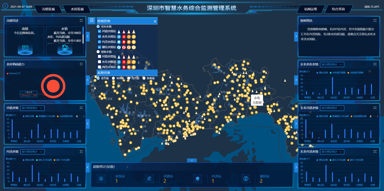 深圳智慧水务综合监测平台是智慧水利水务数据底板的重要支撑平台,以水情、水质、工情等涉水监测信息的汇聚融合、清洗处理、治理提升、分类存储、多维服务为主线,采用微服务、微前端技术体系组件化设计开发,实现了水利水务感知数据的全面汇聚、实时治理、统一管理、服务,为水利水务业务信息化管理实现“可视、可知、可控、可预测”提供高质量的数据支撑,全面提升数据管理水平、服务能力和共享程度。