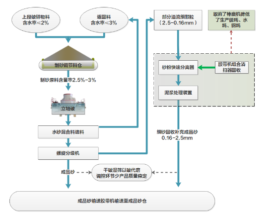 成果名称:一种强风条件下运用高频筛的制砂系统及其方法 完成人:严章国;刘裕;金宇;计春;郝晓波;赵泽晶;曾晓林;白宁;杨军 完成单位:中国水利水电第九工程局有限公司 成果简介:本成果解决了强风地区水利水电工程制砂扬尘、产砂率低,以及高能耗、高水耗、高钢耗、高污染的关键性、共性的技术难题,加快了我国制造强国建设,推动了基础建设高质量发展。创新点如下: 1、首创高压喷淋水砂混合物进料筛分技术,系统性解决了强风下制砂扬尘和原料含水率控制的关键技术难题。 2、采用“干破湿筛”新型制砂技术,攻克了常规“破磨结合”制砂工艺必须使用棒磨机调级导致的“四高”技术难题。 3、自主创新“砂粉快速分离器”和“胶带机组合清扫器”集成技术,通过“量化调控”质量控制系统,解决了生产废水细砂回收再利用的技术难题。 本成果目前已大规模应用于水电和核电工程领域,还可应用于核电、高铁、市政和港航等多个领域,具有矿产资源利用率高、建安成本低、生产运行绿色环保节能低碳和生产成本低的优势,可解决这些领域的制砂问题。