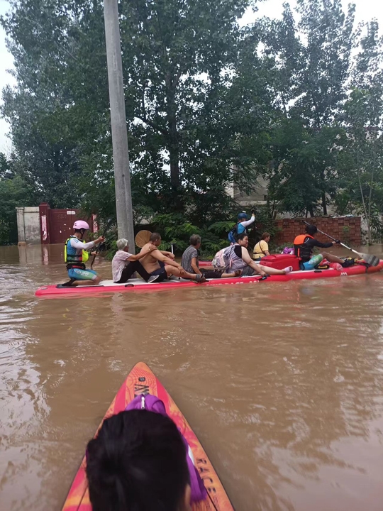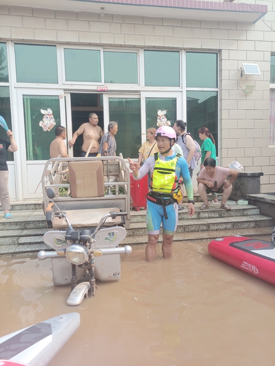 在得知小营村还有被困人员的消息后,洪宝恩同志又冒着激流水深的风险,携两名队员抵达救援难度更大的小营村,依靠浆板这种无动力器材,成功解救一名失联老人。