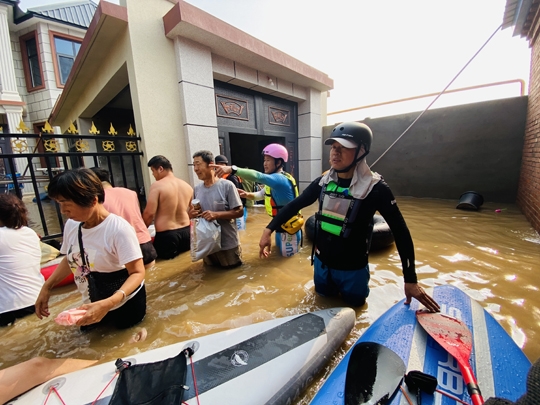 8月3日,洪宝恩同志组建10人桨板救援队,在与涿州当地村镇取得联系后,于凌晨4点多从北京出发,在固安服务区集结、分配物资及安排救援任务后,赴河北涿州小营村实施救援。但在下高速后因洪水险情被阻,无法前往预定地点,故就近在潘各庄先行展开救援。冒着急流、户外深坑及未知异物的危险,救援队分批次将老人、孩子由集中避险的高层房屋运送至村外安全地带,奋战6小时,解救受困群众50余人。