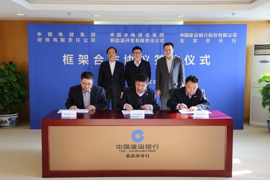 1月11日上午,电建集团所属水电新能源公司投资的阳东农垦局宝山风电场、磐安青山尖风电场等四个新能源开发项目《金融合作框架协议》签约仪式在建设银行北京分行举行。电建财务公司总经理陈波、新能源公司总经理吴洵和建设银行北京分行副行长王新立等相关领导见证了签约仪式。