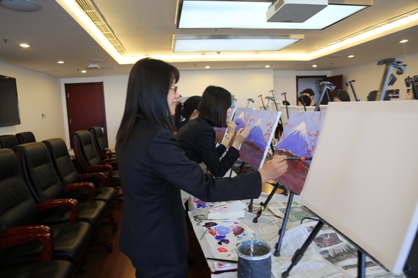 工会为每一位女职工送上表达节日问候的鲜花。工会办公室主任崔萍代表工会向全体女职工致辞,2018年是在党的十九大胜利召开后,股份公司党委“党建质量提升年”的决策部署,为有效落实股份公司的决策部署,加强财务公司企业党建建设,培育弘扬优秀企业文化,构建彰显新时代新特征下女职工的精神面貌,公司工会在公司党委的领导下,在工会主席的带领下,特意举办这次零基础绘画体验活动,庆祝属于女同胞自己的节日。大家在画师的带领下,很快投入到打底稿、涂色、调整的绘画创作中,一时间,会议室里欢声笑语,每个女职工脸上都洋溢着快乐的笑容,现场气氛格外温馨,整个会议室春意盎然。半天时光匆匆飞逝,每个女职工都收获了一幅自己努力完成的美丽油画。