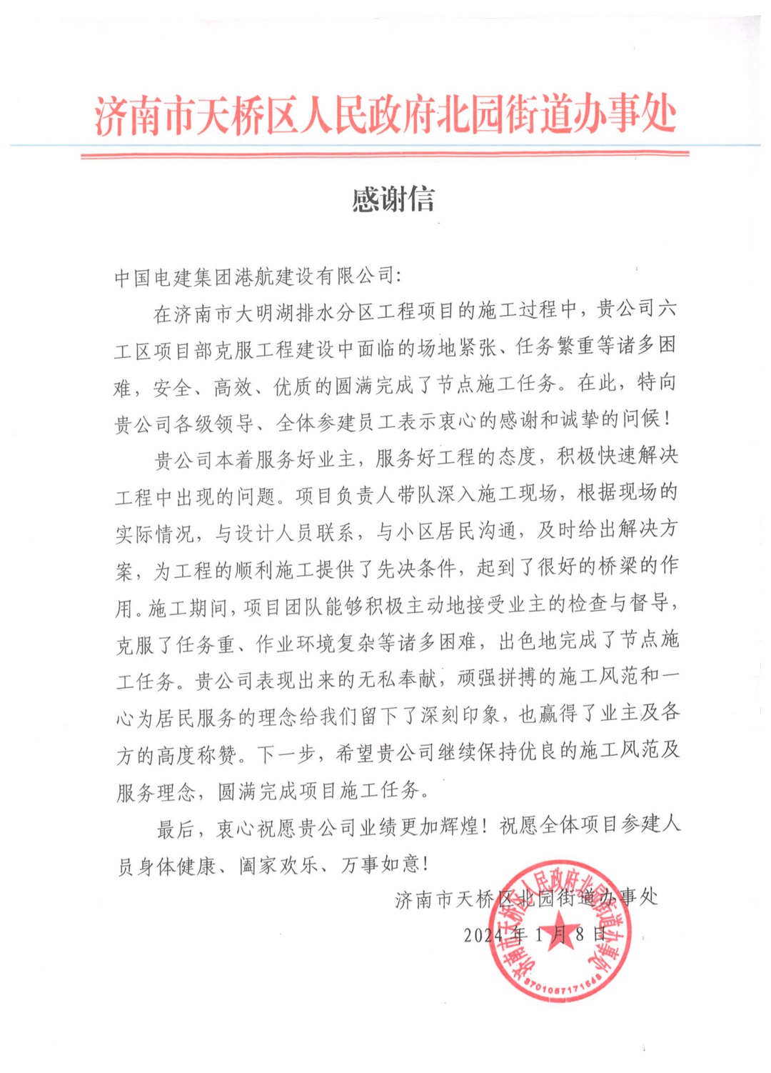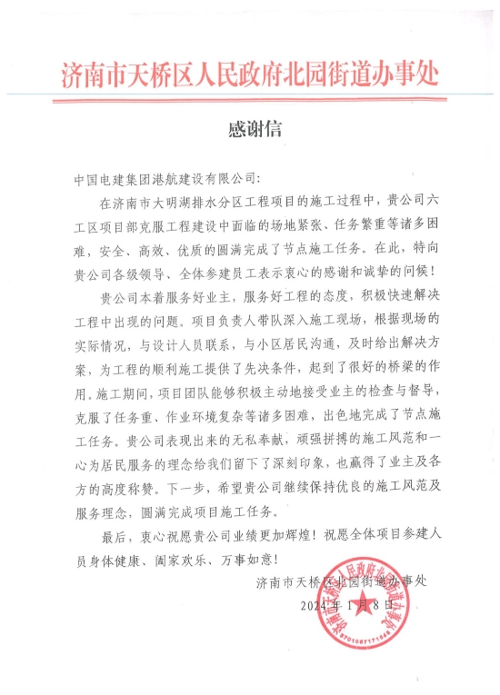 近日,基础设施工程分公司济南大明湖项目收到济南市天桥区人民政府发来的感谢信,信中对项目2023年雨污分流改造工程各节点顺利实施表示认可,对项目部积极协调各方关系,想民之所想,解民之所难,彰显出的央企责任担当表示高度赞扬。 项目建设范围多位于济南市老城区,地下管网多为老旧排水管网,雨污合流、管道淤堵严重,常年遭受城市内涝之苦,施工面临工程点多面广、干扰因素多、协调工作量大等困难。自工程实施以来,项目部始终秉承“真抓实干、马上就办”的工作作风,精心部署、科学组织,优化施工工序,合理分配资源。安排专人积极协调业主、设计、监理单位及当地政府、社区,在狠抓工程质量、严控安全生产的同时,加快推进项目施工进度,获得了社区、业主单位一致好评和赞扬。 下一步,项目部将持续秉持自强不息、勇于超越的企业精神,心系民生,聚焦群众“急难愁盼”问题,多举措打造群众满意的安心工程、放心工程、精品工程。 |