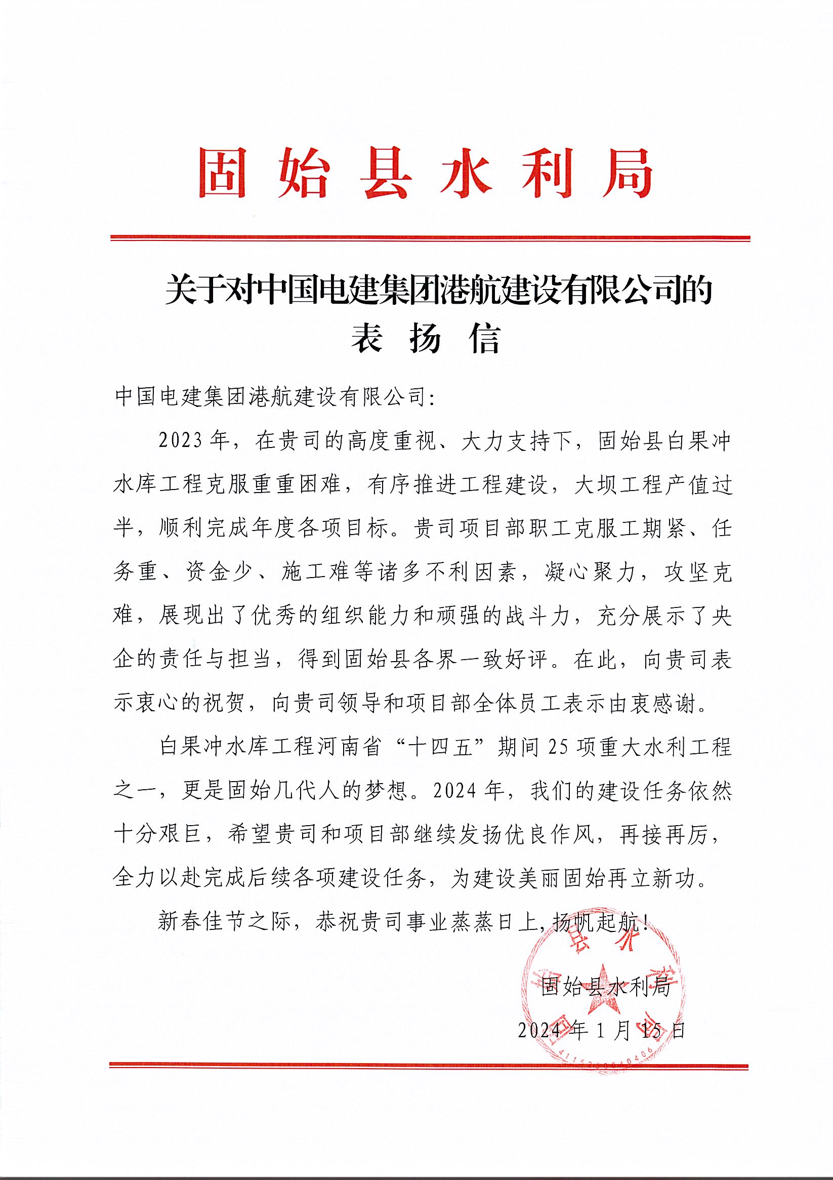 近日,固始县白果冲水库工程项目收到固始县水利局发来的表扬信,信中对项目整体进展、质量、安全管理以及在建设过程中展现的履约责任和社会担当给予高度赞扬。 自固始县白果冲水库工程项目承建以来,项目团队始终坚持严谨、稳重、扎实的工作作风,全面克服工期紧、任务重、施工难度大、周边环境复杂等诸多不利因素,团结一致,攻坚克难,有序推进项目建设,在2023年按期完成大坝产值过半的年度任务目标,切实展现出优秀的组织能力和顽强的奋斗精神,得到固始县各界的一致认可和广泛好评。 在后续工作中,固始县白果冲水库项目全员将再接再厉、奋力拼搏,坚持发扬苦干实干的工作作风,扎实完成各项施工任务,以高标准、高质量的建设成果向固始人民交上一份满意的答卷。 |