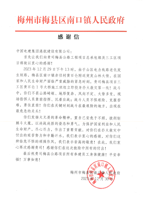 新年伊始,公司收到梅州市梅县区南口镇人民政府发来的表扬信,信中对公司梅县公路项目参建职工在山林突发火情时不惧艰险、挺身而出的行为表示衷心感谢和崇高敬意。 2023年12月29日下午13时,由于山区电力线路老化发生短路,梅县区南口镇赤径村黄石仑附近突发山林火情,在国家和人民生命财产面临严重威胁的紧急时刻,公司梅县项目三工区黄石仑1号大桥施工班组立即投身扑火救灾第一线,不畏山路崎岖、地形复杂、风向不定、火势多变,现场指挥人员靠前指挥、沉着应战;战斗人员不畏艰险、勇往直前,在关键时刻战斗在最艰险的地方,出现在最危急的关头。 建一处工程,守一方安宁。项目部迅速反应勇灭山火,展现了今天竞彩足球 的央企担当和良好形象,也再一次检验了项目部的应急处置能力。在建好工程的同时,公司将持续融入驻地发展,构建和谐美好的企地关系,进一步助推企业高质量发展。 |