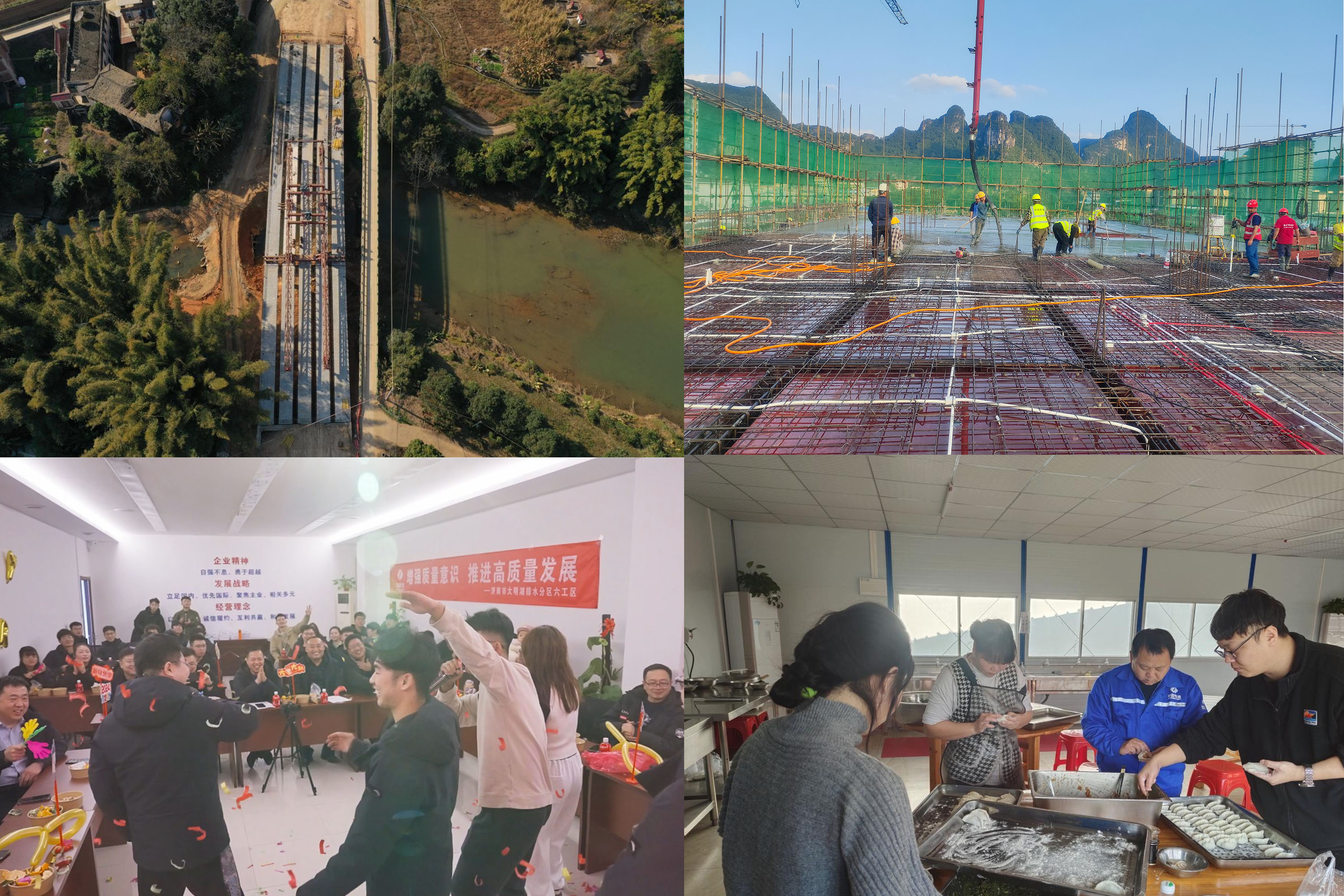 翻山公路气势恢宏,场馆高楼拔地而起。元旦假期期间,基础设施工程分公司各个重大项目建设现场,建设者们埋头弯腰坚守岗位,仍然是一派忙碌景象。各项目部开足马力跑出工程建设“加速度”,以独特的方式迎接新的一年。 “通车的日子又近了” 省道S242线梅县区梅西至程江公路建设工程(西部旅游快线)三工区现场40名工人坚守在各自岗位,指挥着架桥机在空中“搭起积木”。当最后一片预制箱梁平稳落定,全长90米的寮背塘中桥箱梁全部顺利架设完成,成为2024年的第一份新年贺礼。 “梅县三工区项目主线共要建设10座桥梁,途经南口镇和程江镇。南口镇内的5座桥梁,我们总共架设了452片预制箱梁。寮背塘中桥是南口镇最后一座完成架设的桥梁。正值新年来临,南口至程江的主线通道全部打通。通车的日子又近了!”分公司副总经理兼梅县公路项目常务副经理杨垒兴奋的介绍道。 “封顶的节点快到了” 大新县多馆合一项目施工现场上机器轰鸣,一片忙碌。现场木工班组、水电班组、钢筋班组等3个作业班组40余名工人挥汗如雨、争分夺秒,为了工期和质量,夜以继日加紧建设。截至目前,主楼正在进行五层屋面结构模板铺装,完成工程进度的97%,主楼封顶指日可待。 项目经理刘建平介绍:“大新县多馆合一项目是集文化馆、图书馆、土司博物馆、综合体育馆、辅助办公、全民健身中心等综合性的多功能用房,是当地的重要民生工程。为了如期主体封顶,项目部合理规划工程进度,倒排工期、挑灯夜战。随着主楼屋面模板铺设,接下来我们马上就可以封顶了。” “欢快的歌声更响了” “倒计时6、5、4、3、2、1”!伴随着大屏幕中间的倒计时和主持人高昂嘹亮的声音,六位青年小伙激情澎湃跳起开场舞蹈,济南市大明湖排水分区工程六工区项目元旦联欢会拉开序幕。联欢会内容丰富,歌舞、小品、诗朗诵等精彩节目层出不穷,会场内欢声笑语、载歌载舞,气氛温馨活跃。在看完项目部一路走来的视频集锦后,众人共同唱响《最初的梦想》。 “我自己都不敢相信,项目各部门职工能够利用工作空闲时间排练,自导自演、自编自唱11个节目。我在台上看表演别有一番味道,尤其是看到许多新入职的毕业生在不停拍照发给父母和朋友,心里特别自豪。大家是真心地把项目部当做自己的家。”项目联欢会主要策划兼主持人——青年职工刘婷文这样说道。 “工地的年味更足了” 元旦当天,重庆(万盛)内陆无水港(低碳产业园)项目的职工聚在食堂,互相切磋包饺子的技巧。大家边取馅捏皮,边聊天谈心,忙得不亦乐乎,其乐融融的氛围萦绕在项目每个角落。约20名职工第一次在重庆过年,他们以饱满的热情,用北方人特有的包饺子习俗,寄托早日归家、平安团圆之情。 项目办公室负责人贾飞说:“咱们北方人过节肯定少不了吃一顿饺子。虽然想念家里的味道,但是能和同甘共苦的同事们在一起,年味儿也足了!” 山水万程,步履不停。奋斗新征程上,基础设施工程分公司190余名职工保持昂扬的斗志,踔厉奋发,向前的脚步毫不停歇,全力推动2024年各重大项目建设强劲开局。 |