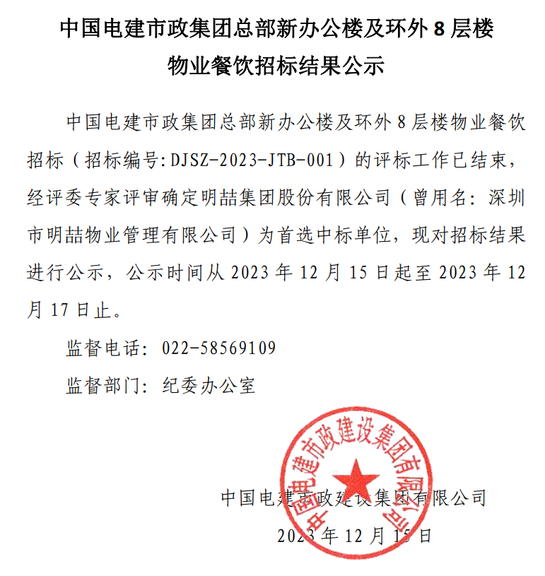 关于公司总部新办公楼及环外8层楼物业餐饮招标结果的公示