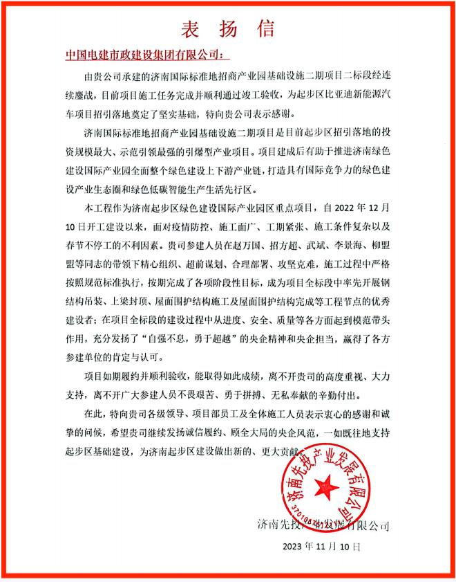 日前,由山东公司承建的济南国际标准地招商产业园基础设施二期项目收到业主单位的表扬信,信中对项目团队的施工管理能力、顽强拼搏的工作作风、央企的责任担当给予高度赞扬。 信中表示,项目团队在面对疫情防控、施工面广、工期紧张、施工条件复杂以及春节不停工等不利因素时,能够精心组织、超前谋划、合理部署、攻坚克难;施工过程中严格按照规范标准执行,按期完成了各项阶段性目标,成为项目全标段中率先开展钢结构吊装、主体结构封顶、屋面围护结构施工及竣工验收等工程节点的优秀建设者。 济南国际标准地招商产业园基础设施二期项目是目前起步区招引落地的投资规模最大、示范引领最强的引爆型产业项目。项目总建筑面积108722.35平方米,建成后有助于推进济南绿色建设国际产业园全面整个绿色建设上下游产业链,打造具有国际竞争力的绿色建设产业生态圈和绿色低碳智能生产生活先行区。 接下来,项目部全体员工将继续秉承“精心”与“匠心”的追求,全面提升项目管理水平,认真做好项目收尾工作,继续发扬诚信履约、顾全大局的央企风范,为公司的高质量发展奠定坚实基础。 |