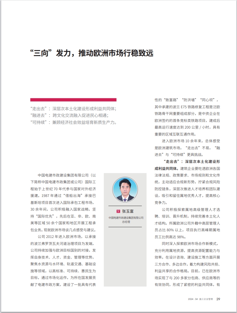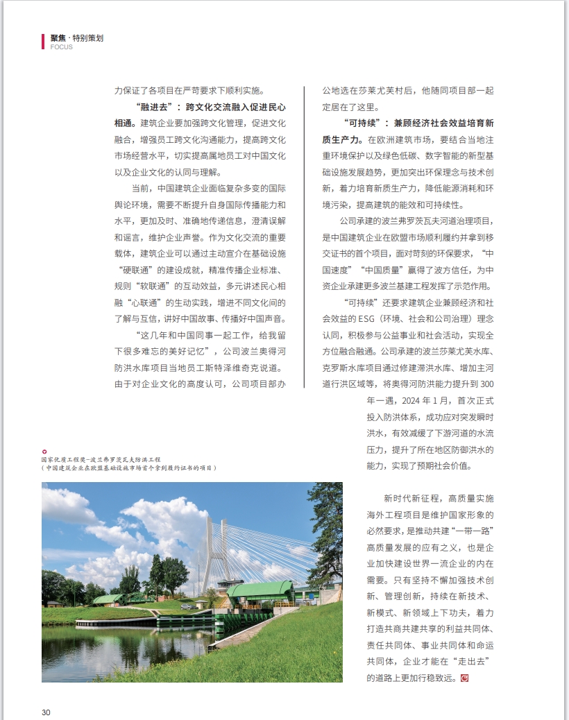 今天竞彩足球 市政集团国际工程始于20世纪70年代国家对外经济援建。1987年“借船出海”承接巴基斯坦项目,首次进入国际承包工程市场。30余年间,公司积极融入国家战略,坚持“国际优先”,先后在亚、非、欧、南美等区域的50余个国家和地区开展工程承包业务。 以2012年承接的波兰弗罗茨瓦夫河道治理项目为发端,公司加强与欧洲目标国别的对接,努力寻求利益契合点和合作最大公约数,聚焦水资源与水环境、轨道交通、基础设施等领域,以高标准、可持续、惠民生为目标,发挥自身在基础设施建设领域的资金、技术、人才、管理等优势,通过市场化运作,为当地发展贡献了电建市政方案,建设了一批具有代表性的“致富路”“防洪墙”“同心坝”。承建的波兰E75铁路修复工程是泛欧铁路骨干网重要组成部分,是中资企业在欧洲签约的首条竞标类铁路项目,建成后最高运行速度达到200公里/小时,具有重要的区域互联互通作用。 进入欧洲市场10余年来,总体感受是欧洲建筑市场,“走出去”不易,“融进去”与“可持续”更具挑战。 “走出去”:深层次本土化建设形成利益共同体 建筑企业要吃透欧洲各国法律法规、政策要求、市场规则和文化传统,主动适应合规新形势,拧紧合规风险防控链条,深层次推进人才培养和团队建设,吸引和留住属地优秀人才,提高核心竞争力。 今天竞彩足球 市政集团积极探索属地高级管理人才选聘、培训、晋升机制,持续完善本土化人才结构。所属欧洲公司外籍中高层管理人员占比80%以上,项目执行高峰期属地员工比例高达98%,本土化建设成效显著。 公司深入探索欧洲市场合作新模式,充分利用属地资源,提高资源配置能力与效率。在设计咨询、建设施工等方面开展三方合作、多边合作,着力构建风险共担、利益共享的合作格局。目前,已在欧洲市场实现了与200多家分包商、供应商等的有效协同,形成了紧密的利益共同体,有力保证了各项目在严苛要求下的顺利实施。 “融进去”:跨文化交流融入促进民心相通 建筑企业要加强跨文化管理,促进文化融合,增强员工跨文化沟通能力,提高跨文化市场经营水平,切实提高属地员工对中国文化以及企业文化的认同与理解。 当前,中国建筑企业面临复杂多变的国际舆论环境,需要不断提升自身国际传播能力和水平,更加及时、准确地传递信息,澄清误解和谣言,维护企业声誉。作为文化交流的重要载体,建筑企业可以通过主动宣介在基础设施“硬联通”的建设成就,精准传播企业标准、规则“软联通”的互动效益,多元讲述民心相融“心联通”的生动实践,增进不同文化间的了解与互信,讲好中国故事、传播好中国声音。 “这几年和中国同事一起工作,给我留下很多难忘的美好记忆”,公司波兰奥得河防洪水库项目当地员工斯特泽维奇克说道。由于对企业文化的高度认可,项目部办公地选在莎莱尤芙村后,他随同项目部一起定居在了这里。 “可持续”:兼顾经济社会效益培育新质生产力 在欧洲建筑市场,要结合当地注重环境保护以及绿色低碳、数字智能的新型基础设施发展趋势,更加突出环保理念与技术创新,着力培育新质生产力,降低能源消耗和环境污染,提高建筑的能效和可持续性。 公司承建的波兰弗罗茨瓦夫河道治理项目,是中国建筑企业在欧盟市场顺利履约并拿到移交证书的首个项目,面对苛刻的环保要求,“中国速度”“中国质量”赢得了波方信任,为中资企业承建更多波兰基建工程发挥了示范作用。 “可持续”还要求建筑企业兼顾经济和社会效益的 ESG(环境、社会和公司治理)理念认同,积极参与公益事业和社会活动,实现全方位融合融通。公司承建的波兰莎莱尤芙水库、克罗斯水库项目通过修建滞洪水库、增加主河道行洪区域等,将奥得河防洪能力提升到300年一遇,2024年1月,首次正式投入防洪体系,成功应对突发瞬时洪水,有效减缓了下游河道的水流压力,提升了所在地区防御洪水的能力,实现了预期社会价值。 新时代新征程,高质量开拓及实施海外工程项目是维护国家形象和外交大局的必然要求,是推动共建“一带一路”高质量发展的应有之义,也是企业加快建设世界一流企业的内在需要。只有坚持不懈加强技术创新、管理创新,持续在新技术、新模式、新领域上下功夫,着力打造共商共建共享的利益共同体、责任共同体、事业共同体和命运共同体,企业才能在“走出去”的道路上更加行稳致远。 公司党委副书记、总经理张玉富在《施工企业管理》上发表署名文章《“三向”发力,推动欧洲市场行稳致远》 |
