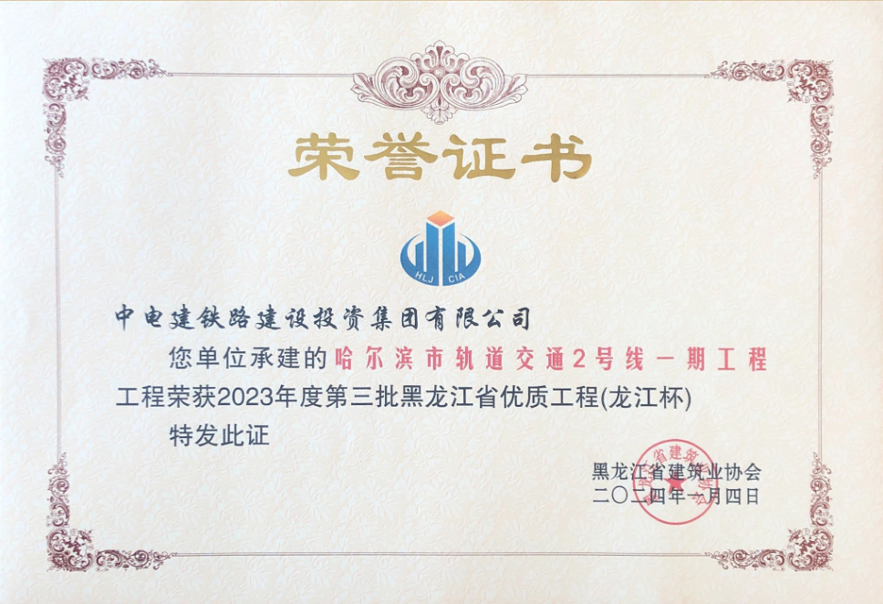哈尔滨地铁2号线荣获2023年度黑龙江省优质工程奖